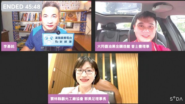 ▲大同醬油黑金釀造館╱協會理事曾士豐(右上)與雲林縣觀光工廠協會理事長郭美足(下),接受漢聲廣播電台《FB新鮮事》訪談。