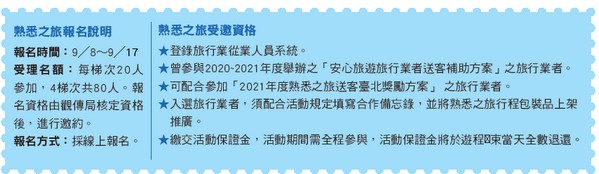 臺北市觀光傳播局於9╱6、9╱7分別 於高雄國賓大飯店及台中金典酒店 舉辦「2021年度臺北熟悉之旅推廣媒合說 明會」,2場活動超過200家旅行業者參 加。推廣媒合說明會更集結了臺北市特色 餐廳、飯店、伴手禮、體驗活動、景點等 30家業者與中南部旅行業者媒合商機,現 場除了介紹臺北市最新推薦活動與熱門景 點外,同時觀傳局也規劃「熟悉之旅」4 條2日遊路線,邀請全台旅行業者實地踩 線,讓參與的旅行業者更了解臺北市豐沛 的觀光資源。此外,配合熟悉之旅遊程連 結媒合會參與的業者,將景點包裝、上架 推廣並實際送客至臺北,就有機會拿到限 額的送客臺北活動獎勵金。