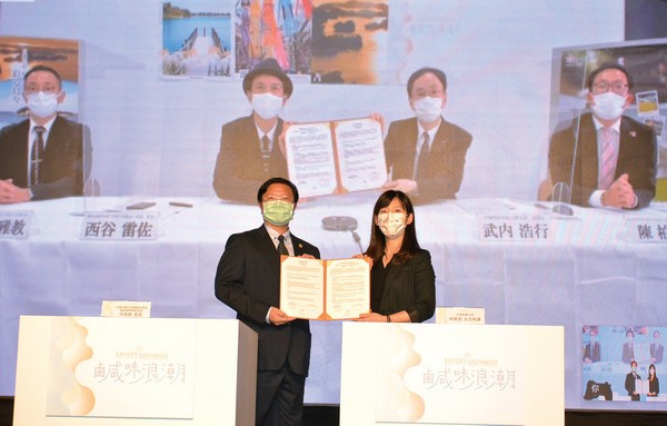 會中除了邀請在地超過30家具代表性的 業者, 展示一系列「鹹味浪潮」品牌建構 的成果之外,更重要的是,雲嘉南觀光圈 與日本仙台松島觀光圈締結姐妹觀光圈, 並與仙台松島DMO(In-outbound sendai-matsushima inc.)社長西谷雷佐、日本三賢旅 行社部長佐瀬友一,簽署觀光合作備忘錄。未來透過觀光、產物推廣方式互惠兩地,將能結合兩地觀光資源,實現跨國境的合作。