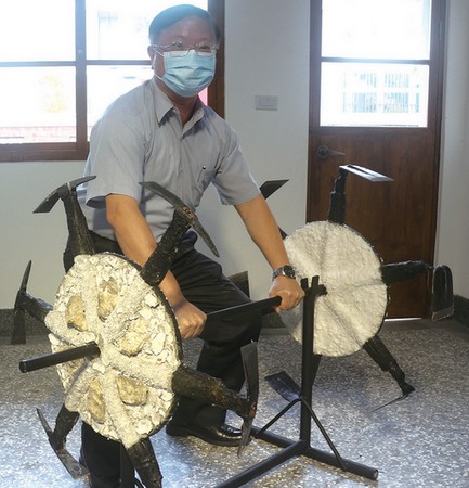 ▲交通部觀光局雲嘉南濱海國家風景區管理處處長徐振能體驗以在地蚵殼和成功鹽製作而成的舉重槓鈴。