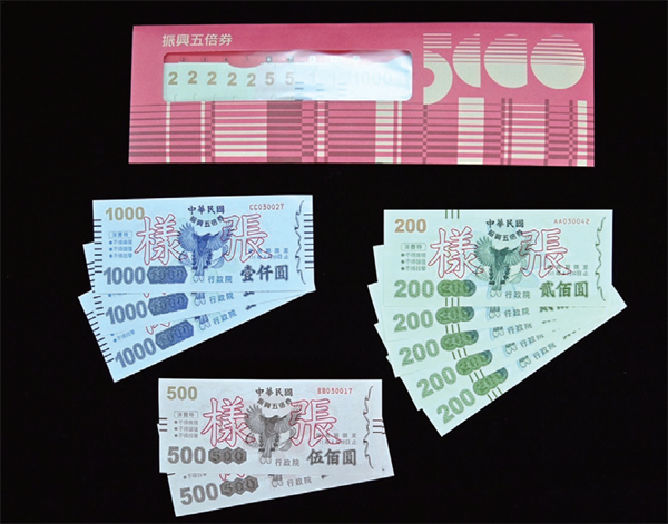 ▲振興五倍券面額為200元5張、500元2張及1,000元3張。
