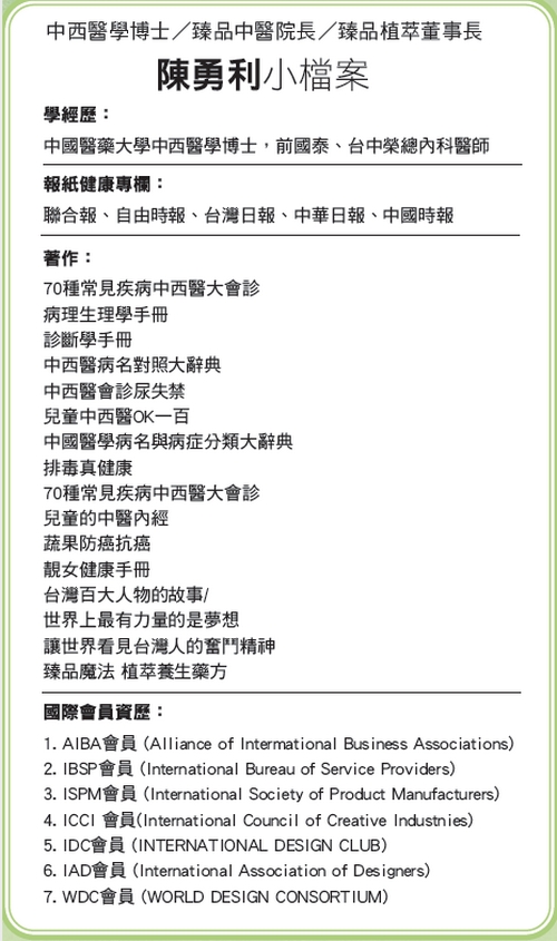 話說當年勇,1999年臻品中醫這個品牌首度面世,以 治療疾病為主旨,身為院長的陳勇利是中西醫學博士醫 生,也是前國泰、台中榮總內科醫生以及美國東方醫學 研究院客座教授,並擔任聯合報、自由時報及台灣日報 健康專欄作家。