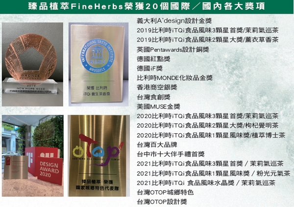 阿利博士說,一般市面養生花草茶、比較 無法顧慮到花草之間、寒熱虛補的平衡,喝多 了、難免有過寒過熱之顧慮;所以他用27年的 中醫臨床經驗、挑選養生花草精華,調配出的 茉莉氣巡茶,更獲得國際比利時International Taste Institute風味絕佳3顆星最高榮譽、薰衣草 香茶則獲得2顆星大獎,國際大賽的肯定,更讓 「臻品植萃FineHerbs」堅持品質、追求日常養 生的宗旨發光發熱。