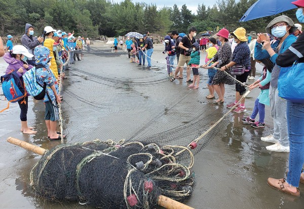 ▲由於風浪過大,牽罟活動取消出海捕魚,改為在海灘牽罟導覽解說。