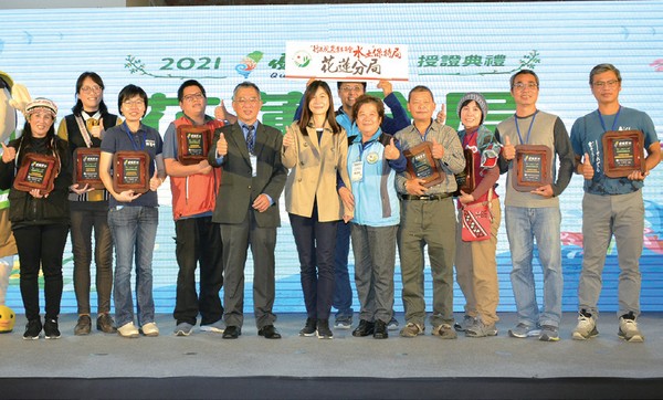▲(左5起)水保局主任秘書陳重光、水保局組長陳玲岑、花蓮 分局長陳淑媛與獲獎業者合影。