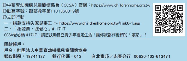 為了讓這群孩子不誤入歧途,洪錦芳 女士20年前創辦社團法人中華育幼機構 兒童關懷協會(CCSA),以「15自立 →30而立」為理念,每年服務近千位的 失家、失愛、觸法或社區困苦兒少,輔 助就業與「教育脫貧」,在愛的支持下 復學、升學,重啟學習與希望,擁有改 變的契機,正向自立自強。