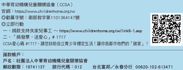 中華育幼機構兒童關懷協會(以下簡 稱:CCSA)長年關心家外安置兒少 福利服務發展,聚焦離舍青少年自立的 正向支持,也重視安置體系從業人員的 專業成長,每年都會辦理多元主題的全 國性研習、論壇等,充實宏觀視野與微 觀實踐,促進兒少保護更佳權益!