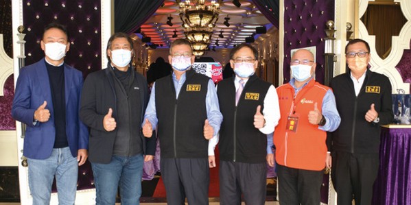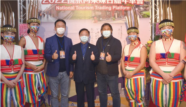 ▲(左3起)台灣入境旅遊協會理事長王全玉、西拉雅國家風景區管理處處長徐振 能、旅行社聯保聯誼會理事長朱永達,參加2022國旅同業媒合嘉年華會。