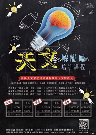 花蓮縣政府辦理「流星花蓮‧山海 星光」天文旅遊系列活動、培 訓課程及「花現天文解說員」認證, 5╱22將在花蓮縣旅遊服務中心舉辦三 星級天文解說員認證考試,已上完花蓮 縣政府主辦之四季天文培訓課程的學員 可報名參加。此外,5╱23至7╱28也將 分別在花蓮市及瑞穗鄉辦理「天文旅遊 解說培訓課程」(春夏季班),兩地各 提供30個名額,由專業的天文講師帶領 學員進行室內課程與戶外實地觀測,深 度認識天文知識,為花蓮的特色星空旅 遊導覽人才培訓紮穩根基。以上課程與 認證考試自即日起於「流星花蓮—山海 星光網站」開放報名。