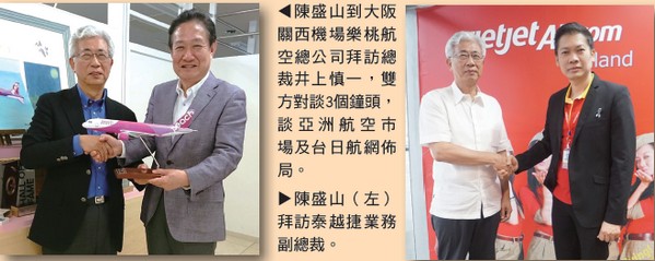 在擔任台中與高雄觀光首長的期間,熟 悉航空公司需求的陳盛山,洽談超過40家 外籍航空的董事長、總經理等經營團隊, 從東北亞一路到東南亞、從傳統航空到盛 行的LCC,他不厭其煩地一一拜會、協商、 談判,進而爭取開航。過程中他以換位思 考的方式,剖析台中、高雄的發展優勢, 以及該航空公司的飛航運能、機隊、時間 帶、載客數、地勤地服等細節問題,讓外 籍航空產生高度興趣。