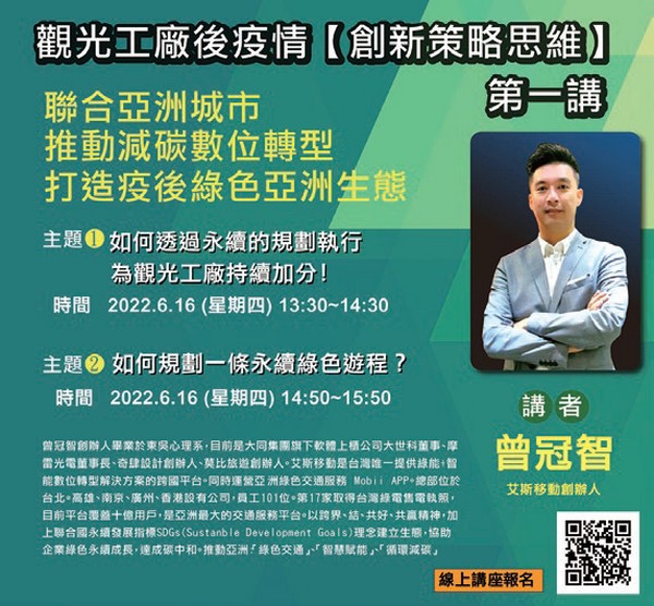 針對此次將舉辦的講座,將從永續、 創新思維、行銷媒體、轉型等多面向為 主,許立昇表示,此次的議題主要針對 經營者與管理者為主,包括特別邀請雄 獅旅遊總經理黃信川分享,會員能從雄 獅在疫情後的多元佈局上,看見上市上 櫃旅遊集團的經營思維,以及如何經營 與行銷的能力。