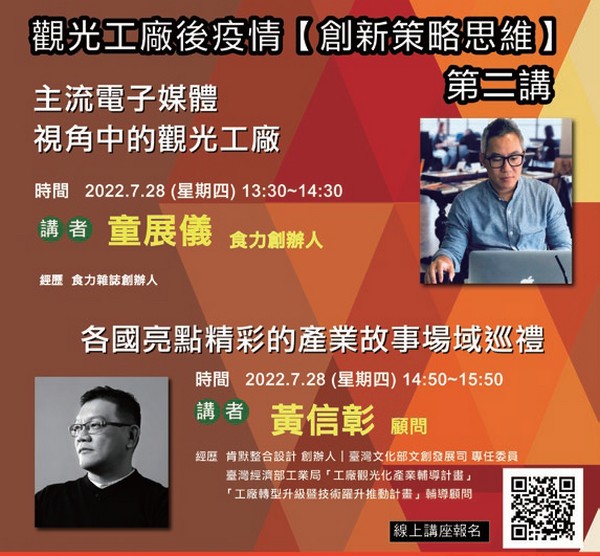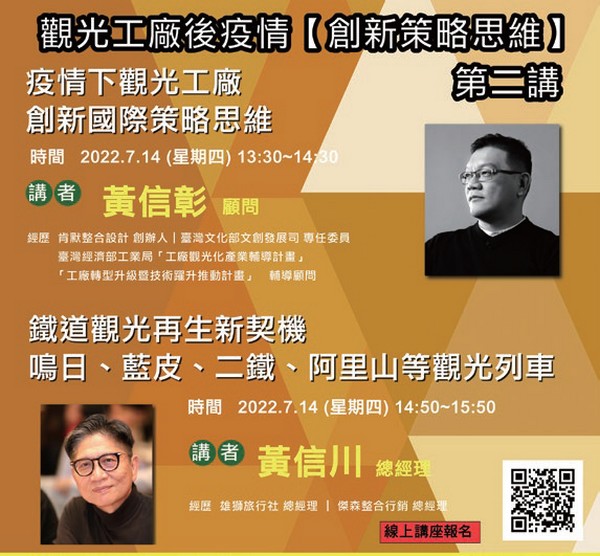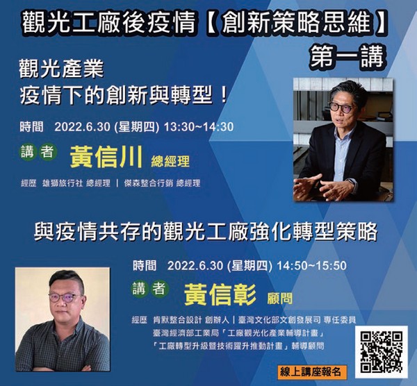 本次TTFA提供精彩議題與業界講師,以 每次兩小時各一小時一個主題一個講者 的焦點講演,持續每兩週一次不同策略 思維主題。透過線上分享與經驗學習, 引進不同面向的思維,希望協助觀光工 廠經營者與管理者開啟『疫後創新經營 策略』的積極性,為與疫情共存時代為 觀光工廠再創高峰!