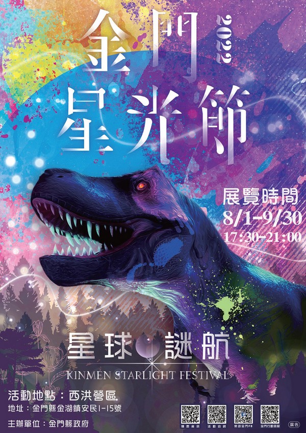 2. 金門星光節(8╱1~9╱30): 展出充滿科幻感的星球謎航與侏儸紀恐 龍等跨時空地景裝置藝術,讓遊客穿越 星空銀河、蟲洞,進入時空旅程感受休 羅紀中的霸王龍、迅猛龍、三角龍,感 受不同以往的聲光震撼。