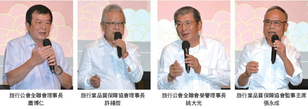 ▲(左起)旅行公會全聯會榮譽理事長姚大光、旅行業品質保障協會理事長許禓哲、監事主席張永成、台灣旅行業協會理事長黃文卿、旅行公會全聯會理事長蕭博仁。