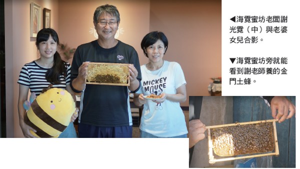 海霓蜜坊取自退休體育老師—謝光霓名字來而, 在台中擔任體育老師期間就不安於室,一直不斷 開發各項興趣,因為喜歡吃留德農業博士開發的枇杷,在新社旁租一塊地, 當小農主人,自己種起枇杷,那時附近養菇農送他們兩箱野蜂試養,因而搭 上了「蜂」潮的不歸路,更成為養蜂行家。謝光霓老師分享,金門土蜂因為 海域封閉,是自古在大小金門土生土長的原生種,完全適應在地環境,而且 沒有感染嚴重的「爛子病」,族群繁衍良好,更能產出高價值的蜂蜜。現在 結合老婆的烘焙能力,以及女兒畢業後的設計專長,讓養蜂發展農產品附 加價值,現在旅客能在海霓蜜坊品嚐蜂蜜製作的點心,像是鬆餅、糕點、飲 品,以及伴手禮;喜歡蜜蜂知識的旅客,也能來場烈嶼野生蜜蜂認識之旅, 包含原生種野蜂辨識、養蜂工具、養蜂小知識、到實際養蜂操作與相關產出 說明等,成為烈嶼觀光旅遊特色行程之一。