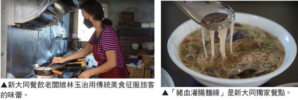 抓住旅客的目光,也要征服他們的胃,才能讓旅客再訪,一道在烈嶼老饕 口耳相傳的美食—「豬血灌腸麵線」是新大同獨家餐點。這道必點料理的 由來是當初老闆在碾石廠兼職,老闆娘擔心先生吸入太多粉塵,聽說豬血 可幫助清除體內廢物,加上自己也愛吃大腸,就將豬血灌入大腸。而後又 結合蚵仔麵線,推出給常客品嘗後大獲好評,逐漸地變成店內的招牌小 吃。另外,店內的綜合滷味也是饕客到訪必點的餐點之一:海帶、豆乾、 魯蛋、豬頭肉等豐富內料不需太過複雜的調味,只需搭配純樸的醬油膏, 就能喚起你對家鄉外婆拿手菜的的美味回憶。為了讓旅客更加輕鬆品嚐, 在金門縣政府的輔導之下,提升軟硬體設施,包含入口意象與招牌設計調 整、菜單設計與菜品調整,讓不同人數的旅客都能根據全新菜單,選擇適 合的套餐。
