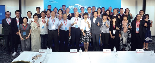 ▲( 最前排左6起)文化台灣基金會榮譽董事長洪孟啟、台灣旅遊交流協會理事長賴瑟珍、旅行業全聯會理事長蕭博仁、海峽兩岸旅遊交流協會台北辦事處主任任佳燕,與文化、傳媒、旅遊、藝術等各界嘉賓合影。