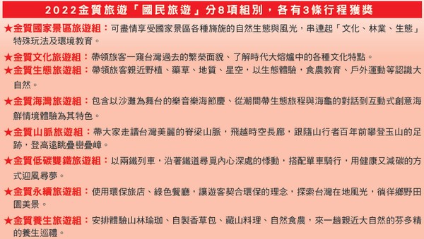 在「入境旅遊」獲獎行程中,囊括了 「國際魅力景區旅遊組」、「大陸地區 來台旅遊」、「港澳地區來台旅遊」、 「東南亞地區來台旅遊」、「東北亞地 區來台旅遊」、「歐美紐澳地區來台旅 遊」等6項組別,共12條行程獲獎。所 有行程均結合了各部會暨有觀光資源, 讓入境旅客細細品味台灣之美,體驗台 灣的山海、地質、生態、人文、美食多 元特色,將臺灣多元的自然風光及人文 景觀,用嶄新的風貌推廣出去,期待國 境開放後,能吸引更多國外遊客愛上台 灣。
