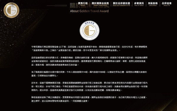 能被旅遊產業視為最高榮譽的獎項,非「國際金旅獎」莫屬,這個由旅行業品質保障協會(簡稱品保協會)所推動的評選認證,自2012年施行以來,已成為消費者心中選購優質商品的最佳保障。