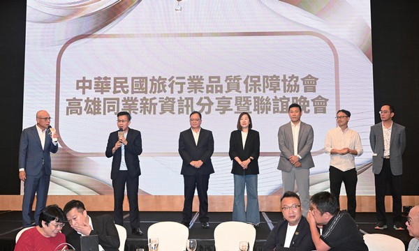 ▲(左起)省公會理事長樓麗萍、旅行公會總會理事長吳盈良、旅行業品質保障協會理事長張永成、監事會召集人黃文卿、高雄旅行公會理事長蔡宗佑。