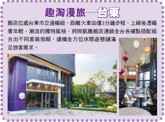 無畏新型冠狀肺炎的衝擊,穩坐台灣飯店龍頭的凱撒飯店連鎖選擇於此時再度出手,以旗下設計風格旅店品牌「Hotel Cham Cham趣淘漫旅」台東館,作為延伸到台東的服務觸角。隨著5月份試營運後,6/5將正式開幕,該飯店不僅是「趣淘漫旅」繼台北、台南後第3個連鎖據點,更是凱撒飯店連鎖旗下第10家據點,將集團旗下各品牌飯店客房數總數提升至3,100間。