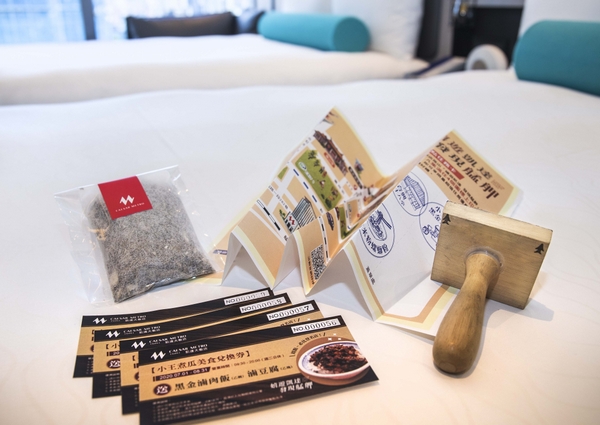 ▲台北凱達大飯店美食兌換券、地圖、青草包。