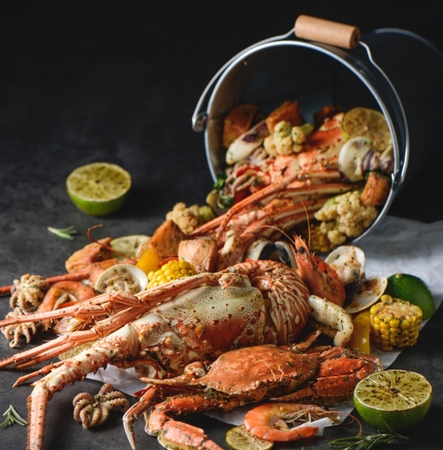 ▲內含龍蝦、螃蟹、鮮蝦、蛤蠣等各式好料的澎湃海鮮桶。