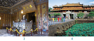 順化於1558至1945年間都是越南的皇城,以紫禁城為藍本而建立的順化皇城,正是個麻雀雖小五臟俱全的小故宮,其中最值得一看的就是「午門」,門前三座金水橋是皇城地標。越南史上花費最高的啟定皇陵,結合中、法文化的外觀神秘低調,走入最高的「啟成殿」卻是金碧輝煌,前廳天頂上的龍形水墨畫,據說是畫師用腳一筆一劃費時完成。地板是彩色琉璃瓦,兩側牆上鑲嵌著成千上萬片瓷磚與琉璃拼成的壁畫,不同主題的精彩讓人嘆為觀止。
