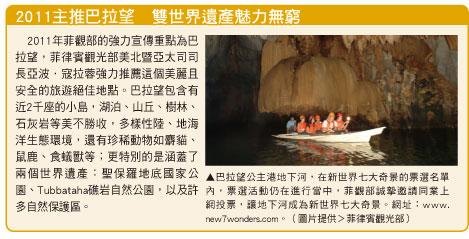 亞波.寇拉蓉同時表示,在知名的《The Lonely Planet》上,形容菲律賓為東南亞旅遊最後一塊淨土,而多樣化旅遊景點、自然未開發環境、野生動植物生態都是旅遊的優勢。除了最大城市馬尼拉、海島天堂長灘島、夏都碧瑤、冒險勝地大堡、賞鯨鯊好去處Bicol、自然生態豐富的薄荷島等地,今年更重點推薦全新的~巴拉望旅遊,期待菲律賓為台灣旅客的旅遊下一站。