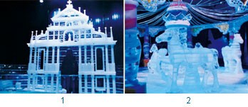 1.「冰FUN世界」呈獻知名地標,如澳門大三巴牌坊。2.「冰FUN世界」娛樂區的旋轉木馬,可供小朋友玩樂。
