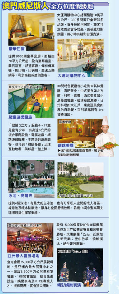 澳門威尼斯人度假村酒店會議及展覽統籌副總裁狄沃夫指出,澳門威尼斯人一直致力開發多元化和別開生面的娛樂表演,「冰FUN世界」將為澳門締造前所未有的新體驗。展場分9 區,第一區引導區有澳門地標建築,第二區首度在澳門引進彩色冰,第三區古典文學演繹,如《西遊記》,第四區冰雪森林,第五區世界知名建築,第六、七區娛樂區有旋轉木馬、城堡,第八區冰河時代,第九區冰吧提供冰製水酒杯品嚐飲料。更詳盡訊息請查詢:www. venetianmacao.com/tw/
