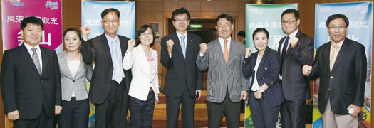 ▲韓國東海岸圈代表來台拚觀光,(左起)釜山廣域市觀光振興課副課長盧東哲、具民淑、蔚山廣域市觀光振興課吳世敏、慶尚北道觀光振興課鄭景姬、韓國觀光公社台北支社長劉鎮鎬、慶尚北道觀光振興課長金周靈、江原道廳觀光行銷本部海外行銷主務官李少嬉、江原道廳觀光行銷白承萬。