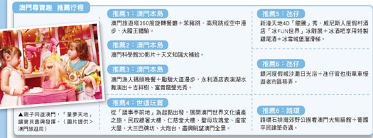 林鴻祥也指出,在氹仔島別錯過路氹金光大道,除了澳門銀河度假城之外,威尼斯人度假村酒店內有「貢多拉遊船」、「太陽劇團ZAiA秀」、「冰FUN世界」冰雕展、「歷險Q 立方」等;新濠天地則有「龍騰秀」動畫、「水舞間」表演、「童夢天地」,絕對讓爸爸媽媽與寶貝們享受無與倫比的視覺震撼與體驗,更是消暑至極;而路環島則以親近自然與生態為主題,諸如罕見的黑沙海灘、澳門大熊貓館等,為澳門添上新話題,蒐羅各式各樣的元素,宜動宜靜,集熱鬧與悠閒於一身,一趟3天2夜的小旅行,是親子共遊、感受澳門的最佳選擇。