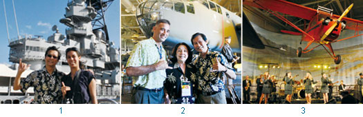 1.夏威夷觀光局亞洲代表施春庭(左)/助理Elisa於珍珠港密蘇里戰艦前。2.(左起)夏威夷觀光暨會議局市場銷售、企業會議及獎勵旅遊副總裁麥克.莫瑞(Michael Murray)、PRIME管理總監Priscilla A. Texeira、夏威夷觀光局亞洲代表施春庭。3.第十四屆泛太平洋獎勵旅遊暨商務會議交流說明會晚宴於太平洋航空博物館舉辦。