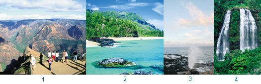 1. 有「太平洋的大峽谷」之稱的威美亞峽谷(Waimea Canyon)是可愛島必遊景點。(圖片提供>夏威夷觀光局) 2.可愛島全島佈滿飛流直下的瀑布,圖為知名Opaeka瀑布。(圖片提供>夏威夷觀光局) 3.位於波伊普的號角噴潮孔穴的日落美景。 4.可愛島海灘。(圖片提供>夏威夷觀光局)