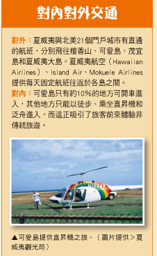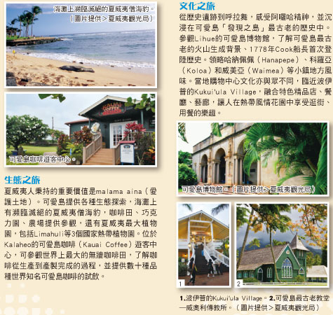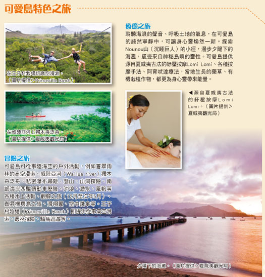 可愛島(Kauai)全島綠意蔥鬱,擁有「花園之島」的美譽,由於對環保生態的重視,因此得以保有純淨清新之美,全島茂盛的山林、青翠的洞穴、人煙稀少的沙灘和隱密的瀑布等獨特多樣風景一直深受好萊塢製片和生態旅遊愛好者的青睞。夏威夷觀光局台灣&東南亞代表施春庭表示,適合從事戶外運動與生態休閒的可愛島,是全家出遊度假的最佳地點,隱密的世外桃源美景也是婚禮蜜月最浪漫的選擇,此外它擁有可舉辦會議的度假區:波伊普(Poipu)、王子村(Princeville)、卡拉帕奇海灘(Kalapaki),是獎勵旅遊的理想場所。