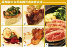 1.來自阿拉斯加的爐烤鮭魚佐愛達荷州洋芋。2.德州的烤豬肋排。3.這道美式傳統萊姆派佐蜂蜜冰淇淋所搭配的是來自蒙大拿州的焦糖醬汁。4.阿拉斯加州的香煎牡丹蝦。5.來自蒙大拿州乾式熟成紐約客牛排。