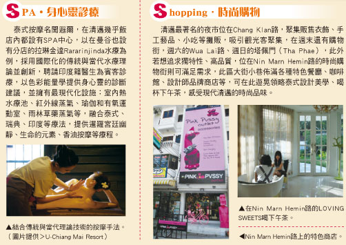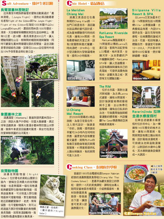提到清邁,不少人的印象與認知偏於靜態、知性或是歷史文化層面,因此過去台灣遊客年齡層稍微高些。泰國觀光局台北辦事處行銷專員李孟珍表示,為了打破一般人的印象,近年來泰觀局極力推動清邁「泰讚3S2C」之旅遊主題:Spa、Shopping、Soft Adventure、Chic Hotel╱Restautant、Cooking Class,希望營造清邁的嶄新形象。復興航空近來大力拓展東南亞市場,除了清邁,普吉島、菲律賓宿霧、帛琉、馬來西亞沙巴都推出包機直航,復興航空營運處客運營業部業務經理陳泓達表示,清邁7月銷售情況理想,復興航空第四季將有新機加入營運,因此以東南亞為焦點的新航線經營,將更有強大奧援,請同業多加推廣。