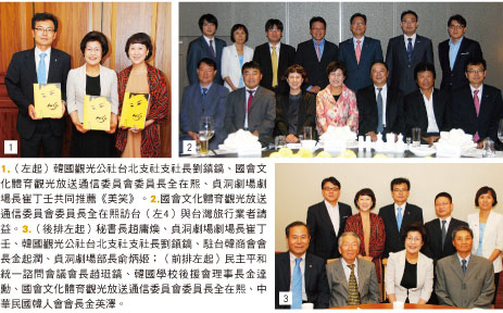 韓國國會議員、文化體育觀光放送通信委員會委員長全在熙於 8 28∼31協貞洞劇場劇場長崔丁壬等多位韓國藝文界成員訪台,主要任務向台灣民眾推廣韓國賣座名劇《MISO美笑》,同時盛情邀請台灣多位資深旅行業者與大韓、韓亞航、釜山航空公司代表餐敘,就目前促進台灣韓國兩地觀光旅遊、推動文化藝術交流等進行商討,廣納業者建言。