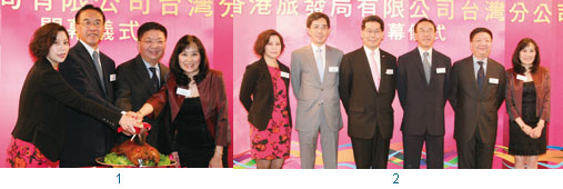 1.香港旅發局有限公司台北分公司舉行正式開幕儀式,(左起)香港旅遊發展局大中華區域總經理葉貞德、香港旅遊發展局主席田北俊、香港旅遊發展局總幹事劉鎮漢,以及香港旅遊發展局台灣處長徐維妮共同以香港傳統習俗—切燒豬來象徵開業順利。2.香港旅發局有限公司台北分公司舉行正式開幕儀式,與會貴賓合影。(左起)香港旅遊發展局大中華區域總經理葉貞德、香港特區政府旅遊事務專員容偉雄、香港特區政府商務及經濟發展局局長蘇錦樑、香港旅遊發展局主席田北俊、香港旅遊發展局總幹事劉鎮漢,以及香港旅遊發展局台灣處長徐維妮。