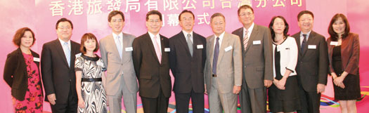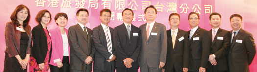 ▲開幕儀式與會貴賓合影,(左起)香港旅發局大中華區域總經理葉貞德、海峽兩岸旅遊交流協會主任劉克智、港台經濟文化合作協進會秘書長李佩詩、香港特區政府旅遊事務專員容偉雄、香港特區政府商務及經濟發展局局長蘇錦樑、香港旅發局主席田北俊、財團法人台港經濟文化合作策進會董事長林振國、旅行同業公會總會理事長姚大光、行政院大陸委員會港澳處專門委員曾美莉、香港旅發局總幹事劉鎮漢、香港旅發局台灣處長徐維妮。
