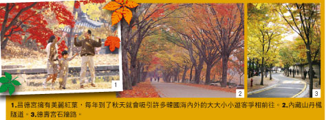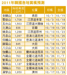 位居韓半島八景之首的內藏山國立公園,每年秋天都吸引一百多萬人次遊人前來造訪。沿著內藏山入山處由50年至200多年樹齡的楓樹形成的紅葉隧道漫步,紅葉將天空映照成了紅色,整座山也被紅葉染成一片紅。坐落於內藏山南部的白羊寺,為巨石和高低相間的山峰所環抱,清澈溪水環寺流淌,呈褐色的軟木櫟、紅色楓葉、黃色櫸樹宛若一幅華麗的彩色水墨畫,令人心曠神怡。氣象廳預測開始的賞楓日期為10╱26,最佳賞楓日則為11╱7。