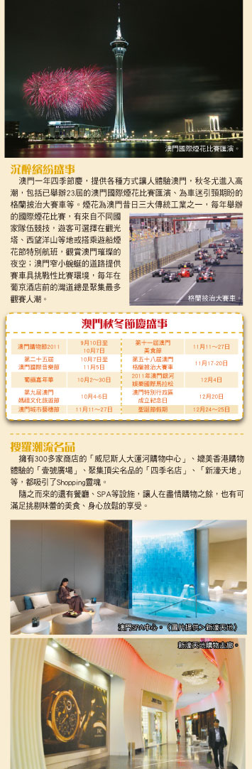根據澳門特別行政區政府資料顯示,澳門旅遊業近年來蓬勃發展, 2011年1月至8月的入境旅客總數達1,849 萬人次,較去年同期增長10.4%,其中台灣入境旅澳人次達84萬,成為第三大族群,澳門顯然已成為台灣居民休閒度假的熱門首選。澳門旅遊局台灣代表處行銷副理歐綉瑜表示,有「東方蒙地卡羅」之稱的澳門,過去長期以來旅客以男性族群為主,近年來由於大型綜合娛樂城等新增,讓家庭旅客可選擇澳門做為度假地點,也獲得女性族群的青睞,因此旅客的來源組成有了翻轉變化。 9╱10∼10╱7舉辦第一屆的澳門購物節,宣傳廣告則特意以「澳門─我的幸福旅程」為文案,訴求女性族群。