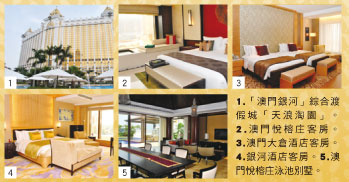 「澳門銀河」引進澳門悅榕庄、澳門大倉酒店及銀河酒店三大品牌,分別提供2百多間、500間、1,500間,共2,200間的五星級客房及套房,澳門悅榕庄標榜為澳門首家全泳池套房度假村,所有豪華套房內均設有私人的室內悅心池,設有29幢別墅,其中10幢為泳池別墅,附設私人花園及私人游泳池。澳門大倉酒店提供日系酒店貼心服務,所有客房設有42吋電視、備有充電功能的保險箱、浴室內更設有寬闊浴池和智能洗手間等,客房由46平方公尺起,套房由99平方公尺起並配有蒸汽浴室及按摩池等設備。