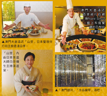 「澳門銀河」設有逾50間餐廳,其中逾半提供泛亞洲美食,並帶來多元化的娛樂新體驗。「山里」日本餐廳,提供壽司、會席料理和炭燒會席料理等,其阿姆斯特丹分店曾在歐洲摘下米其林榮耀。此外,「山里」內設有球狀的茶道室,由日本茶道大師白井彌生主領,提供顧客日本茶道體驗。「和庭」餐廳提供全日餐飲,設有露天茶座,以傳統的日式便當端上精緻的西式料理,為美食增添趣意。「清酒盃」提供超過70種日本清酒,還有駐場專業清酒師為客人提供品酒服務。 「水晶鋼琴」提供LIVE爵士樂,還有日本威士忌、雞尾酒等飲品。「和」大堂酒廊提供「澳門和風菓子下午茶套餐」,可供兩位享用,澳門幣218元。