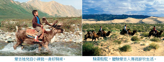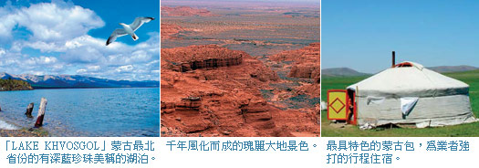 巴奇美代表進一步表示,蒙古旅遊景點與玩法非常的廣泛,目前主要是針對3大方向來推廣。一是歷史文化遺跡;最著名的是成吉思汗建立蒙古帝國所遺留下來的多處遺跡,外蒙對外通商的旅蒙商道;以及紀錄幾千年前當地居民游牧生活的壁畫等等。二是自然生態,比台灣大43倍的蒙古,集合了草原、森林、大漠多種地形,著名的大鷹峽谷,盛夏季節山上白雪皚皚,山下冰川融化、綠草如茵;或遊覽戈壁草原;前往荒漠尋找恐龍骨骸及恐龍蛋化石。三是游牧文化,夜晚享受滿天星斗,直接飲用河水的豪氣,而當地居民仍遵循傳統游牧生活,每年遷徙4次,感受原先只能從歷史課本讀到逐水草而居的生活。