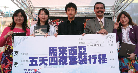 ▲馬來西亞觀光局台北辦事處處長艾芝藍(右2)、馬來西亞亞太區旅遊大使光良(右3),與民眾同樂送出馬來西亞5天套裝行程一份。
