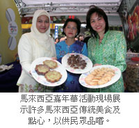 ▲(左起)馬來西亞觀光局台北辦事處處長艾芝藍、馬來西亞亞太區旅遊大使光良、馬來西亞友誼貿易中心拿督辜拉曼、台北市交通局局長羅孝賢及馬來西亞航空公司台灣總經理邵菲恩。馬來西亞嘉年華活動現場展示許多馬來西亞傳統美食及點心,以供民眾品嚐。