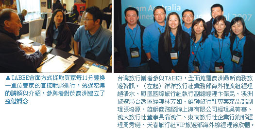 TABEE已然成為全面了解澳洲獎勵旅遊和商務會議新發展的關鍵活動,本屆台灣地區受邀參與的包括:花旗銀行、南山人壽保險、保德信國際人壽保險、美商如新華茂、默沙東藥廠、葡眾企業等6家企業,以及洋洋、鳳凰、雄獅、鴻大、東南與天喜等6家旅行社。會面方式採取買家每11分鐘換一單位賣家的直接對談進行,由於企業代表全數是首次參加TABEE,透過密集的講解與介紹,對於澳洲建立了整體概念。而澳洲旅遊局台灣區經理林芳如表示,獎勵旅遊地點的選擇大多是企業先行決定,因此能打動決策者或執行者/影響者將澳洲作為目標地,便是掌握了先機。