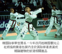 韓國堪稱跆拳王國之一,過去全球旅客多半透過奧運、世運等大型運動比賽或電視轉播欣賞,為讓旅客更進一步觀賞、認識與了解韓國跆拳道,特別在首爾慶熙宮定期安排精彩的跆拳道表演。